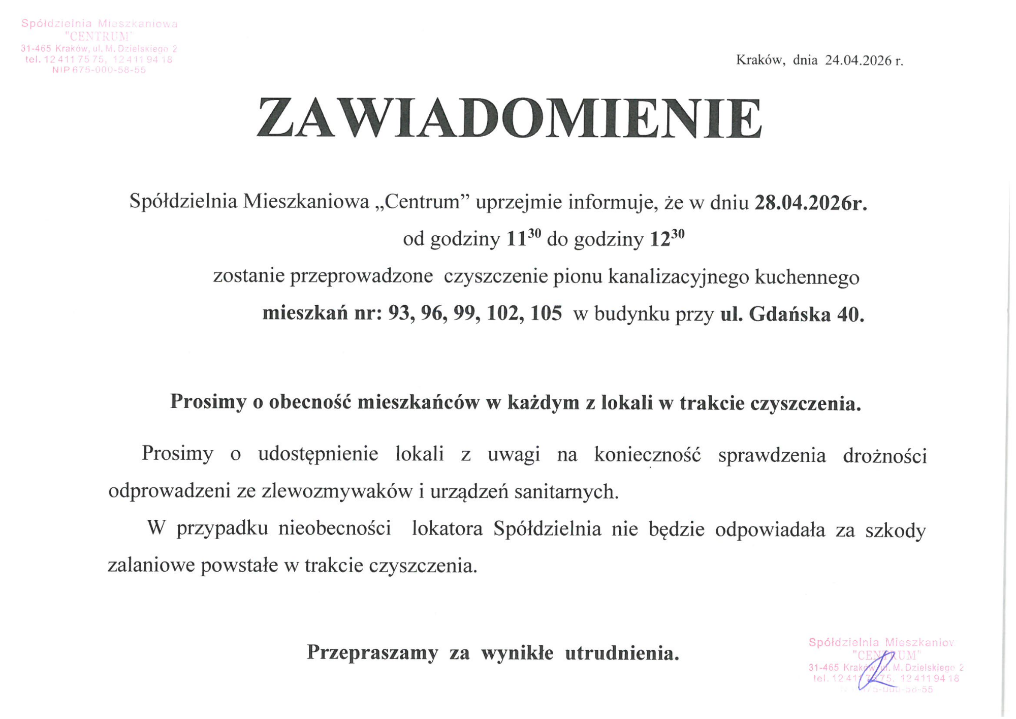 Czyszczenie pionu kanalizacyjnego kuchennego i łazienkowego w budynku przy ul. Gdańska 40 (część mieszkań) w dniu 28 kwietnia 2026 r.