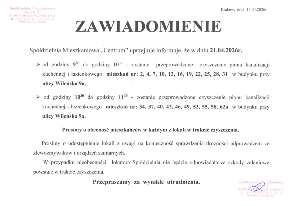 Czyszczenie pionu kanalizacyjnego kuchennego i łazienkowego w budynku przy ul. Wileńskiej 9a (część mieszkań) w dniu 21 kwietnia 2026 r.