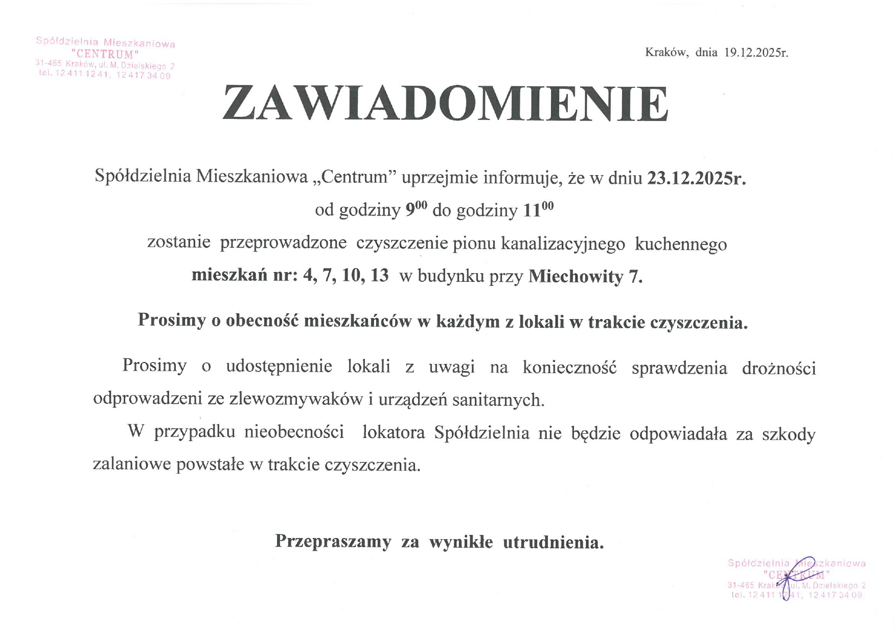AktualnościCzyszczenie pionu kanalizacyjnego kuchennego w budynku przy ul. Miechowity 7 (wybrane mieszkania)
