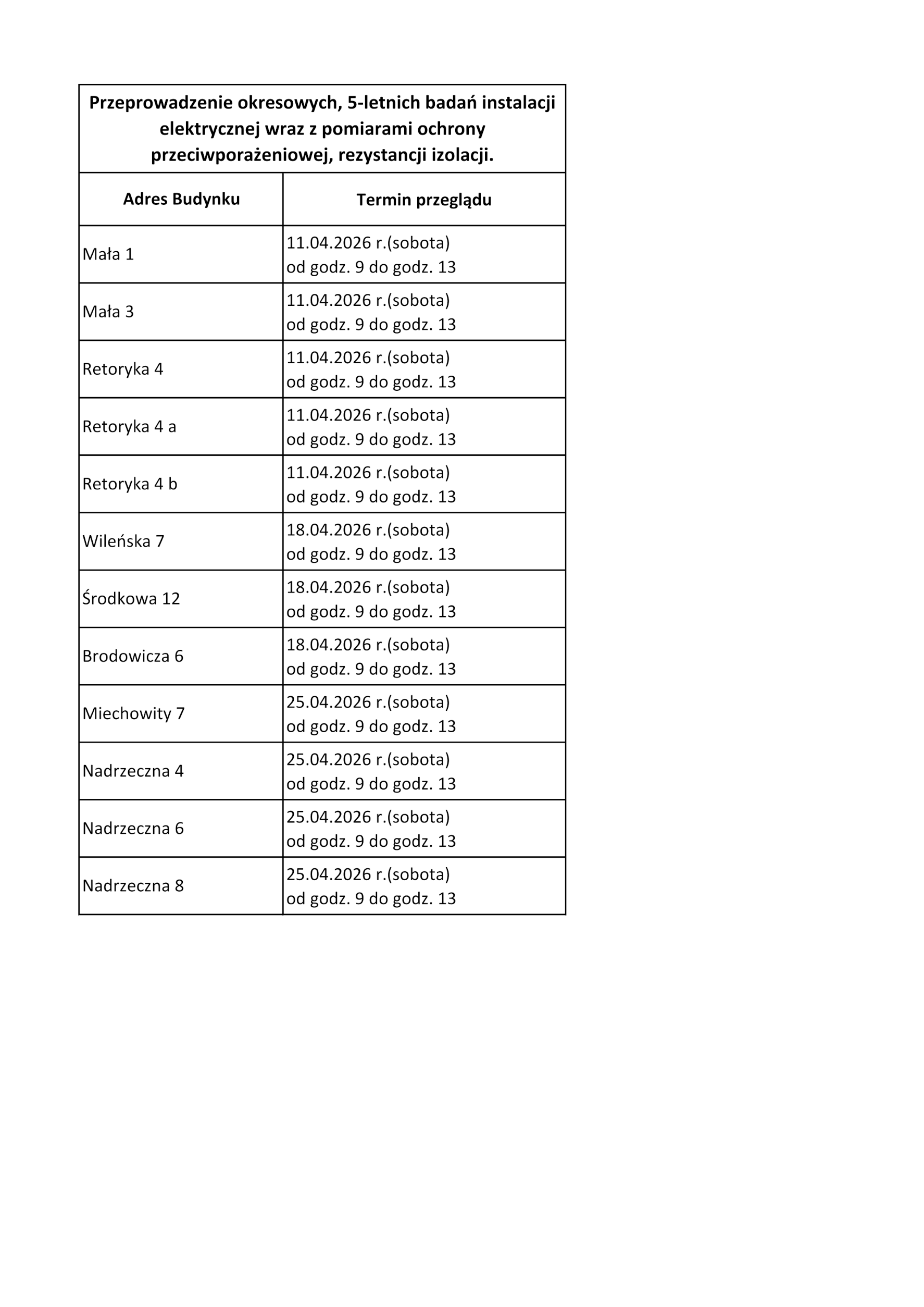 Informujemy, że w dniach 11, 18 i 25 kwietnia 2025 r. odbędzie się drugi termin okresowych 5-letnich przeglądów instalacji elektrycznej dla nieobecnych w pierwszym terminie, dla części budynków SM “Centrum”.