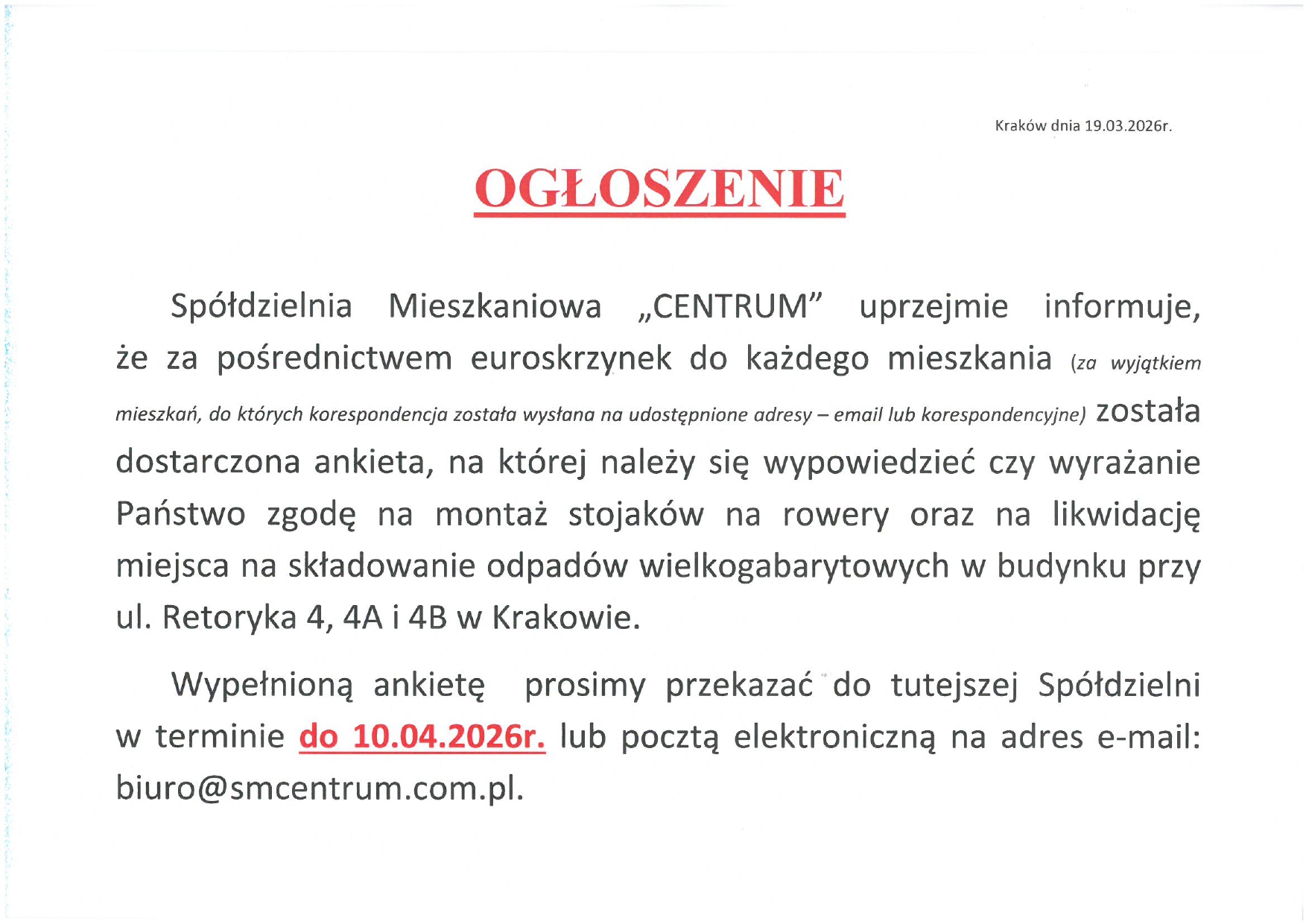 Informacja dla mieszkańców budynku przy ul. Retoryka 4, 4a i 4b w sprawie montażu stojaków na rowery oraz likwidacji miejsca na składowanie odpadów wielkogabarytowych