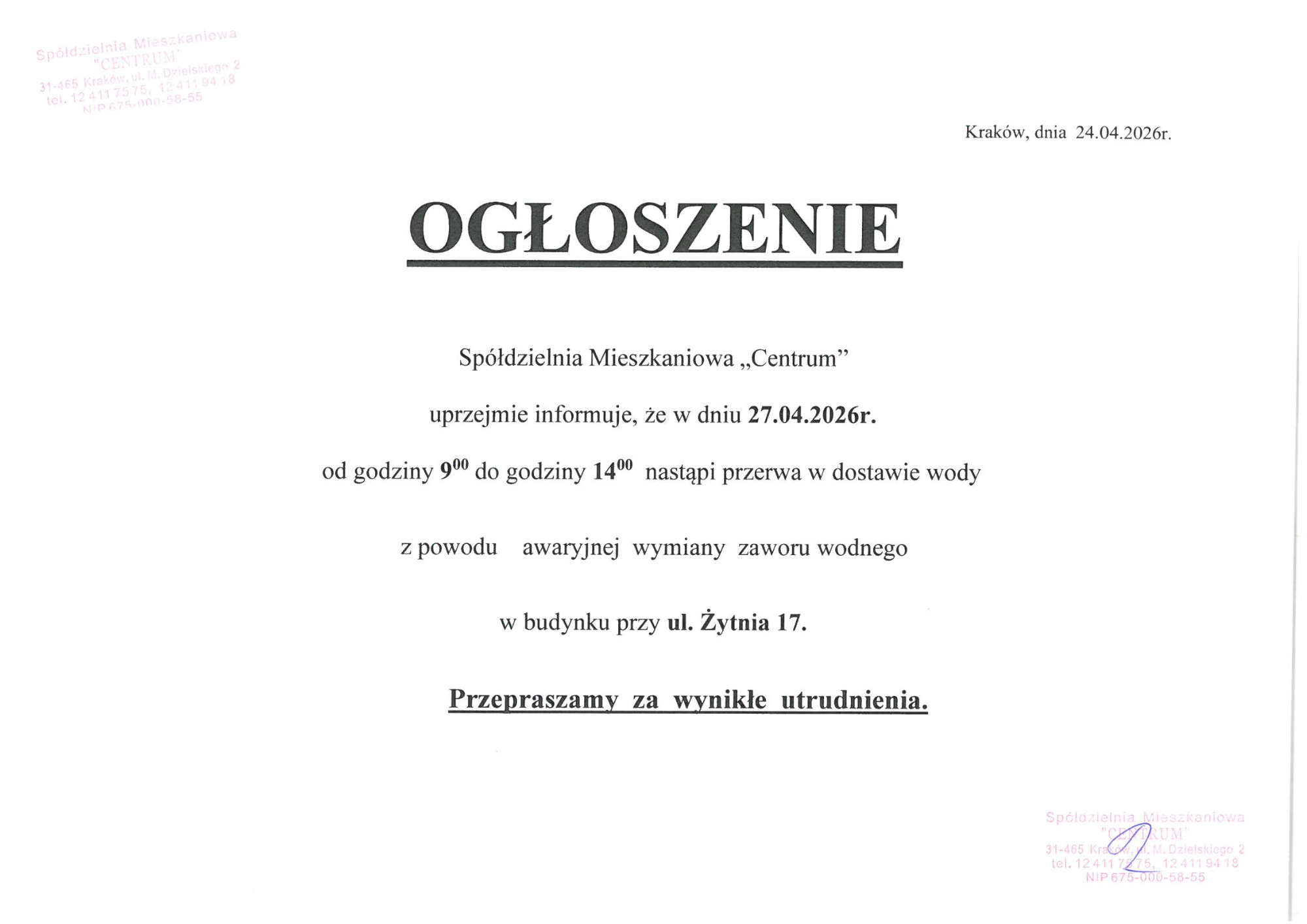 AktualnościPrzerwa w dostawie wody ul. Żytnia 17